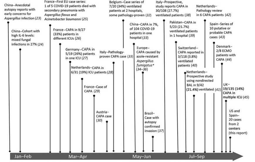 Evidence of secondary aspergillosis developing in persons infected with severe acute respiratory syndrome coronavirus 2 was first evident in China but emphasized more clearly by case series from Europe. We provide a timeline of studies describing secondary aspergillosis occurring in persons with COVID-19, an entity that has become referred to CAPA (Figure 2).