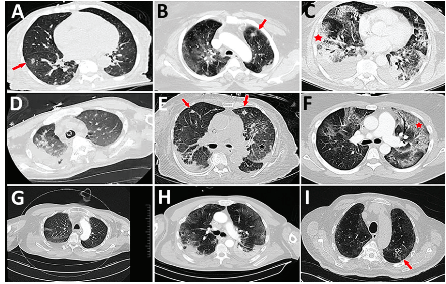 Figure 1. Representative computed tomography (CT) scans for 9 patients with aspergillosis complicating severe viral pneumonia in patients with coronavirus disease. The nodules and cavitating nodules are indicated by red arrows, and prominent airway thickening and bronchiectasis in ground glass opacities are indicated by red stars.