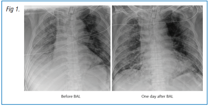 Male patient, aged 66 years was admitted to hospital presenting with cough and fever for 10 days. He had COPD and hypertension. The patient was intubated and ventilated following progressive hypoxemic respiratory failure despite high-flow nasal oxygen therapy (HFNO). Veno-venous ECMO was instituted on day 2 due to refractory severe acute respiratory distress syndrome (SARDS). Chest radiography demonstrated worsening opacification in the right low zone. Hence, bronchoscopy was performed on day 4. Therapeutic BAL was performed in the right lower lobe basal segments. A large quantity of mucus was cleared. A chest X-ray the following day showed clearing of the lung fields and restored visibility of the right hemidiaphragm. (Fig 1)