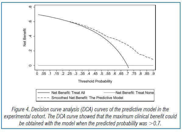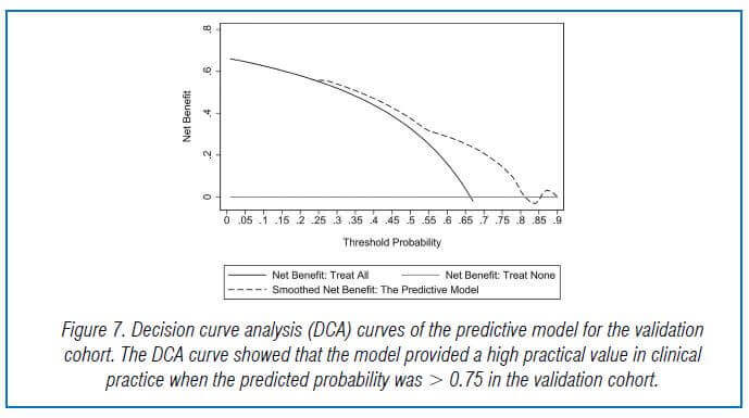 The model’s goodness of fit was assessed using the Hosmer-Lemeshow test, and it showed a good fit with the observed data. The AUC of the predictive model was 0.753, indicating good predictive performance and discriminatory power. The model’s repeatability was also good. The DCA curve showed that the model could provide high practical value in clinical practice when the predicted probability was >0.7.