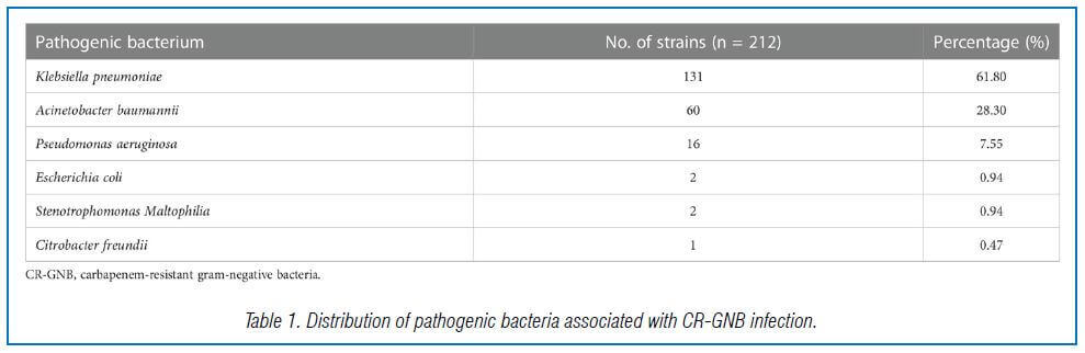 This study included 309 ICU patients with GNB infection out of 908 admitted between December 2017 and September 2020. Of these, 212 patients had CR-GNB infection, with carbapenem-resistant K. pneumoniae being the most common strain, followed by carbapenem- resistant A. baumannii and carbapenem-resistant P. aeruginosa (Table 1).
