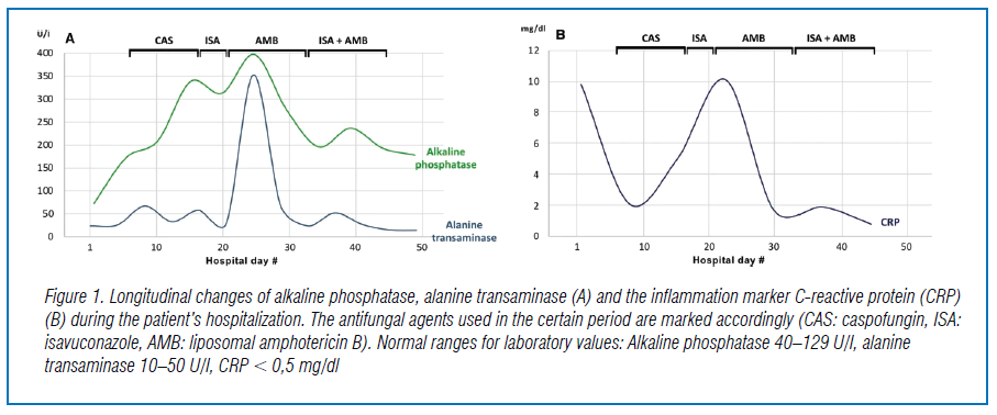 Laboratory findings consisted of slightly increasing transaminases (Fig. 1). An endophthalmitis was ruled out within a week after diagnosis. Extensive imaging, including echocardiography, orthopantomography and magnetic resonance imaging (MRI) of the spine did not reveal any evidence of an infection focus with C. glabrata.