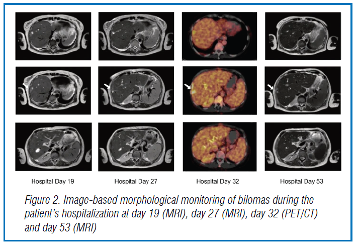 Increased metabolic activity of the known lesions in liver segment VIII were demonstrated by positron emission tomography-computed tomography (PET/CT), consistent with ascending cholangitis. Due to the complex anatomical conditions of the transplanted liver, further intervention by ERC was decided to be forgone. Subsequently we initiated an intensified dual antifungal therapy with high doses of liposomal amphotericin B (daily dose of 6 mg/kg of body weight) and isavuconazole (200 mg three-times daily for two days, followed by 200 mg once daily) on hospital day 34. The intravenous antifungal combination therapy was continued for 14 days after the first negative blood culture and stopped afterwards. Six days after completion of therapy, a follow-up MRI scan of the liver was performed, where cholangitis and bilomas showed to be regressed (Fig. 2).