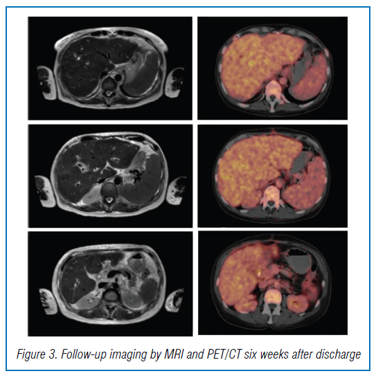 Ten days after discontinuation of dual antifungal therapy an antifungal prophylaxis was administered with posaconazole (300 mg twice on day 1, followed by 300 mg once a day for five weeks). Since this substance has been shown to provide high quality evidence in preventing IFI among immunocompromised patients. Follow-up imaging was performed six weeks after discharge and showed further regression of bilomas compared to the previous examination (Fig. 3). A PET/CT demonstrated lacking metabolic activity of the formerly hypermetabolic sites, consistent with a reduced inflammatory activity. Furthermore, there was no evidence of C. glabrata in the follow-up blood cultures. Of note, creatinine levels had decreased subsequently and were only slightly elevated at the follow-up visit.