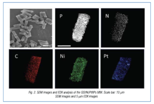 EDX mapping also verifies homogeneous distribution of MM components (carbon, nickel, and platinum), indicating efficient MM electrosynthesis.