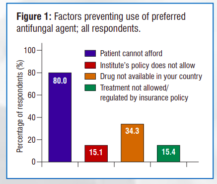 Only 30% had an antifungal stewardship program in their hospital. Eighty percent could not use preferred antifungals due to the cost (see Fig. 1).